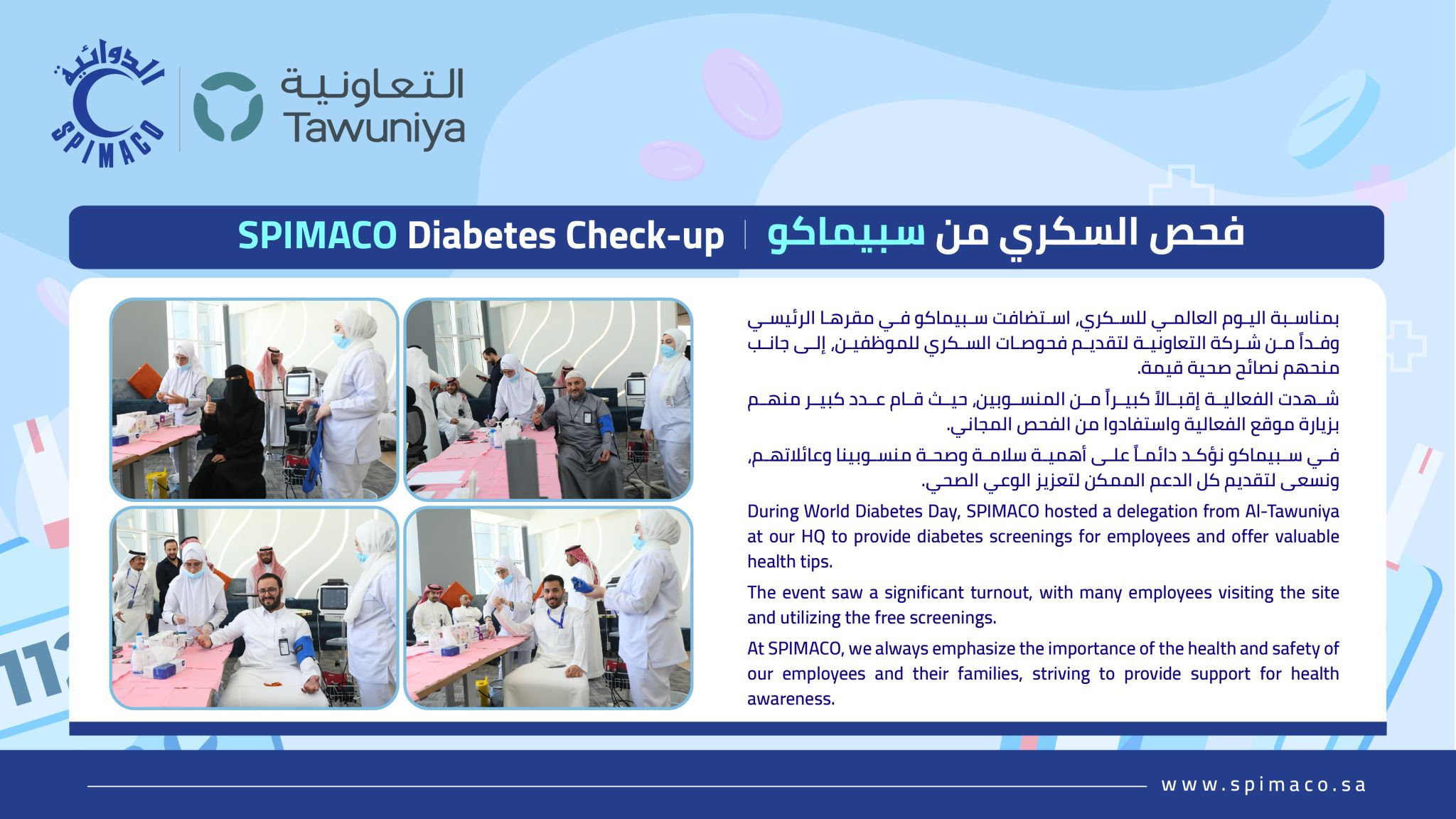 Additionally, we collaborated with a medical team from Tawuniya Insurance to provide comprehensive diabetes screenings for our employees, ensuring their health and well-being.